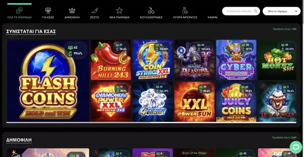 | Τύποι Παιχνιδιών | Φρουτάκια, Ζωντανό Καζίνο, Επιτραπέζια Παιχνίδια, Φρουτάκια Jackpot, Μπίνγκο, Crash, Ζάρια, Κένο, Λοταρία |