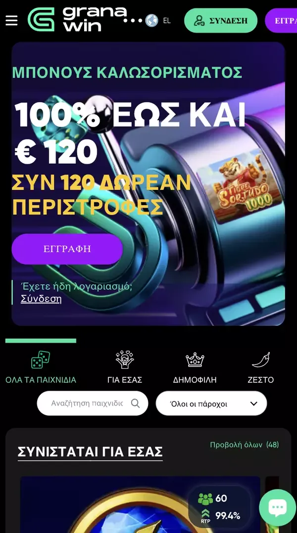 Δεν υπάρχουν συμβιβασμοί στο περιεχόμενο. Στο κινητό, έχεις ακόμη όλη τη γκάμα παιχνιδιών μας, συμπεριλαμβανομένων των κουλοχέρηδων Granawin Casino, των live dealer streams και των αγορών αθλητικού στοιχήματος. Επίσης εμφανίζουμε RTP για κάθε παιχνίδι και ο μέσος όρος της πλατφόρμας είναι 95%, ώστε να μπορείς να ελέγχεις βασικές πληροφορίες πριν παίξεις.